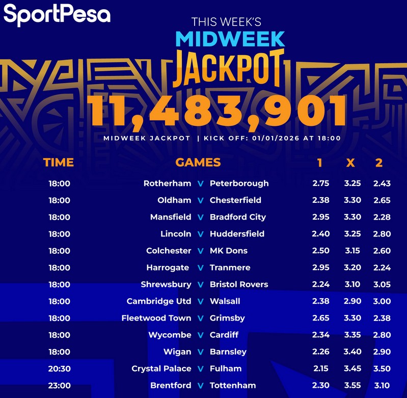 13Games Free Sportpesa Midweek Jackpot Predictions this week,1/1/2026:Win Ksh 11,483,901