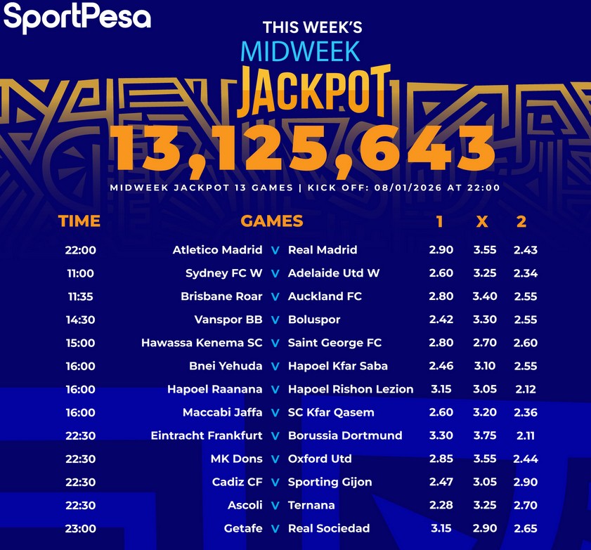 13Games Free Sportpesa Midweek Jackpot Predictions,8/1/2026:Make Ksh 13,125,643