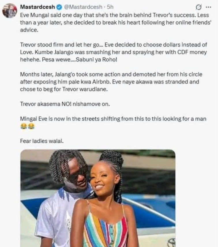 Langata MP Jalango has been dating Eve Mungai. Sources claim that they have dated for about a year. However,the two separated 2 months ago. The source claims that Jalango dumped Eve after sleeping with her. Eve got confused because she expected the relationship to last long.